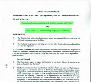 El 12 de febrero de 2025 Neiffert firmó un acuerdo con una agencia que tiene sede en USA y que solo tenía dos meses de existencia para asesoramiento estratégico en inteligencia y enlace entre los departamentos afines de USA y Argentina. A pesar de lo novel de la firma, uno de los argumentos para contratarla, según reza el acuerdo firmado por el representante del gobierno argentino y “Señor 5”, es que «el Cliente considera que el Contratista cuenta con las cualificaciones, la experiencia y las capacidades necesarias para prestarle servicios.”