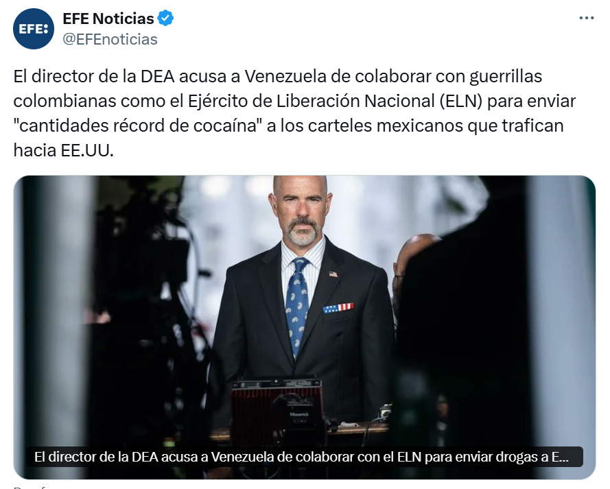 Por supuesto, estos anuncios fueron seguidos por una intensa campaña en los medios de comunicación de altos funcionarios, como la propia Pam Bondi o el jefe de la Administración de Control de Drogas (DEA), para establecer a Maduro como el jefe terrorista de un cartel del narcotráfico. “Si Maduro cae, Nicaragua y Cuba colapsarán. Donald Trump le dirá a los comunistas, y los chinos, quien es el nuevo sheriff en América Latina. Esto es más grande que lo que sucede en Alaska: Ucrania y Rusia están del otro lado del mundo, Trump está limpiando nuestro barrio”, declaró la presentadora Jesse Walters de Fox News en el prime time de la televisión estadounidense.