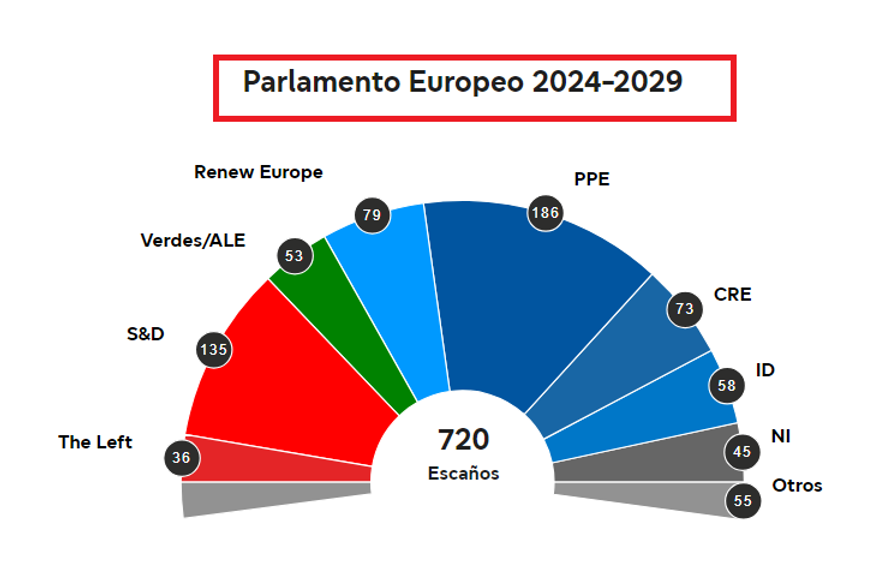 Lo que dejaron las elecciones europeas es -otra vez- un Parlamento fragmentado entre las «familias políticas» o, dicho de otra manera, los partidos hermanados ideológicamente en los distintos países. En ese contexto, la coalición de derecha Partido Popular Europeo (PPE) sigue siendo el grupo más numeroso y, encima, obtuvo 13 escaños más que en 2019 en el Parlamento. El bloque quedó integrado por 186 eurodiputados y representan el 25,83% del total. El segundo bloque en importancia es el Grupo de la Alianza Progresista de Socialistas y Demócratas en el Parlamento Europeo, que perdió 3 bancas pasando de 138 a 135 y representan el 18,75%.