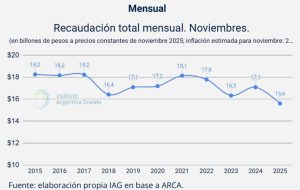 No extraña entonces que la recaudación de noviembre como indica el gráfico del Instituto Argentina Grande, fuera la más baja en dos décadas y el deterioro sostenido del consumo doméstico por los bajos ingresos, es el que explique el colapso.