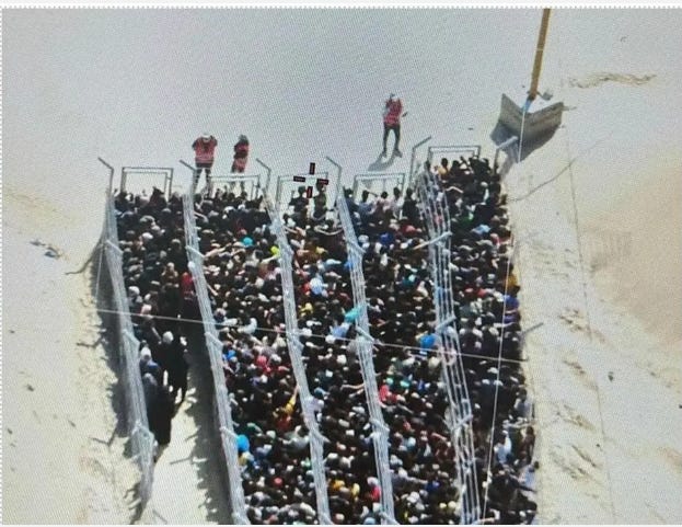 Las instalaciones de la GHF están rodeadas también por tanques y vehículos militares israelíes, de acuerdo a las imágenes satelitales. Estos puntos están conectados a tres caminos: uno destinado para el arribo de camiones con alimentos, y otros dos caminos peatonales de entrada y salida al lugar. Para ingresar a uno de ellos, llamado la “Aldea Sueca”, hay cinco carriles peatonales vallados donde los palestinos deben hacer fila entran mientras son vigilados por cuatro tores de vigilancia a cargo de los contratistas militares de Safe Research Solution, una compañía dirigida por el exoficial de la Agencia Central de Inteligencia, Phill Reilly, y otros mercenarios. En la Aldea Sueca ha habido reportes de, al menos, nueve masacres por disparos de uniformados israelíes, de acuerdo a la investigación de FA. En otra de sus estaciones, colocadas en Wadi Gaza, en el centro de la Franja, ocho veces sucedió lo mismo. “Los emplazamientos de GHF (Tal al-Sultan, el barrio saudí, Khan Younis y Wadi Gaza) se encuentran en zonas de evacuación, lo que significa que los civiles que buscan alimentos deben entrar en zonas que se les ha ordenado abandonar”, según The Guardian.