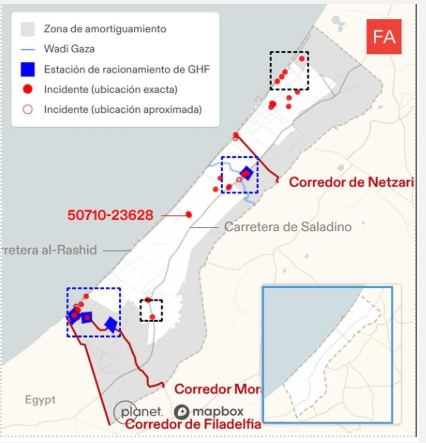 De esta forma se entiende con mayor profundidad la deliberada (y desastrosa) labor de la fundación en sus cuatros puntos de distribución de alimentos. Para la organización Forensic Arquitecture (FA), un grupo de investigación británica dedicada a la investigación forense de crímenes de lesa humanidad, existe varios patrones que revelan la estrategia detrás de su operación. Lo primero es que es evidente que la ubicación de sus cuatros puntos de distribución están relacionados con las posiciones militares israelíes en Gaza: tres están en el extremo sur en Rafah y otro en una zona militar en el centro de la Franja, separados del norte por el corredor militar Netzarim, construido por Israel para partir la región en dos. Por esta ubicación, hay civiles que deben caminar seis horas para ir y volver a estos puntos de distribución. Las rutas que se indican a los palestinos para llegar a las estaciones, además, “los obliga a pasar por unidades y bases militares israelíes”. Los puntos pertenecen tanto a la infraestructura militar israelí que se abastecen a través de las rutas usadas por las Fuerzas de Defensa de Israel para ocupar Gaza.