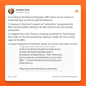 Las presiones prácticas mencionadas anteriormente cobran gran importancia debido a que, históricamente, periodistas y editores han temido ser acusados ​​de antisemitismo por Israel. Es tentador sobreestimar esta presión. Sospecho que se trata más bien de una excusa para justificar la incapacidad de los periodistas para realizar su trabajo correctamente, como lo demuestra su reticencia a reconocer el genocidio de Gaza como tal.