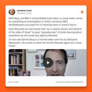 Berg tiene enmarcada una carta de Benjamin Netanyahu y una foto suya con el exembajador israelí en el Reino Unido colgadas en la pared de su casa. Entre sus amigos íntimos se encuentra un antiguo alto funcionario del Mossad. Y cuando el periodista Owen Jones publicó un artículo que revelaba la casi rebelión del personal de la BBC por el papel de Berg, lo primero que pensó Berg fue en buscar asesoramiento legal de Mark Lewis, exdirector de Abogados del Reino Unido por Israel, conocido por utilizar tácticas legales agresivas para intimidar y silenciar a los críticos de Israel .
