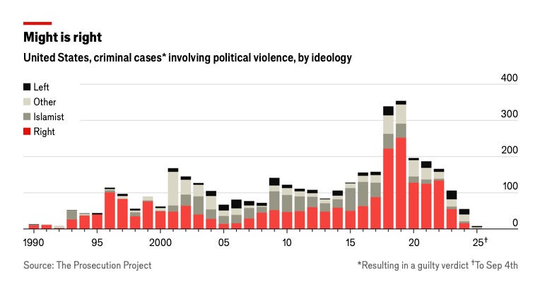 Eso es exactamente lo contrario de lo que muestran las estadísticas: la derecha es históricamente mucho más propensa a usar la violencia política que la izquierda.