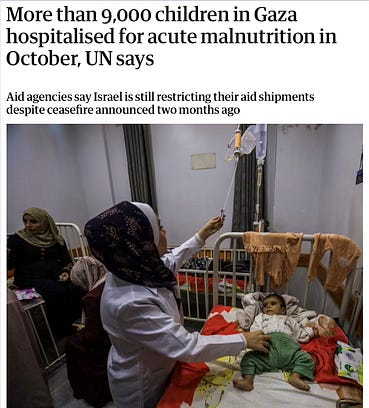 Casi 18.000 bebés y madres primerizas ingresaron en Gaza solo en octubre por desnutrición aguda. Israel permite la entrada de menos del 25% de los camiones de ayuda que prometió en el acuerdo de «alto el fuego».