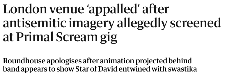 Tomemos el siguiente titular absurdo del periódico: «Sala de Londres ‘horrorizada’ tras supuestamente proyectarse imágenes antisemitas en el concierto de Primal Scream.»