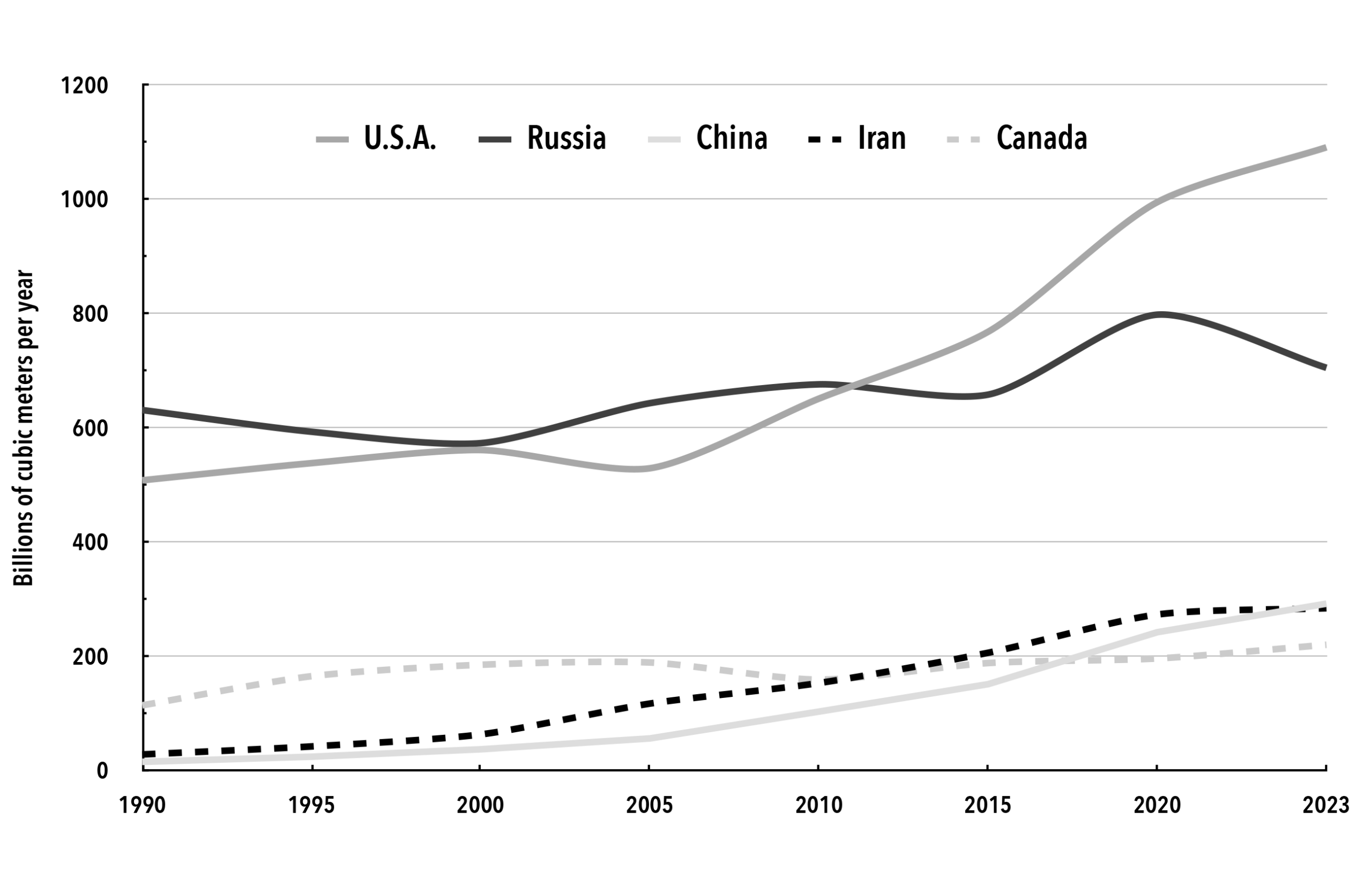 Sin embargo, en el caso del gas natural, el papel principal del poder imperial estadounidense se vuelve sorprendentemente evidente, ya que su dominio se ha consolidado rápidamente gracias a la expansión estratégica de la extracción de esquisto, un esfuerzo que trasciende la producción de energía para reestructurar dependencias globales y profundizar la influencia geopolítica. Entre 2010 y 2022, como se muestra en el Gráfico 1, la producción de gas natural en EE. UU. pasó de 652.000 millones a 1,1 billones de metros cúbicos, una expansión espectacular posible casi en su totalidad gracias a la fracturación hidráulica en formaciones de esquisto. Este auge sin precedentes no solo ha transformado el perfil energético de Estados Unidos, sino que también ha realineado las dinámicas de poder globales centradas en los combustibles fósiles. Mientras que el petróleo fluye a través de un mercado global más interconectado, el gas natural está gobernado por infraestructuras fragmentadas y confinadas regionalmente. Esta división ha generado tensiones geopolíticas evidentes, donde el control sobre las cadenas de suministro y los precios se convierte en una herramienta de dominio estratégico, en lugar de mera competencia en el mercado. En este contexto, Estados Unidos parece estar posicionándose para moldear un mercado global de gas natural, con el objetivo de fijar precios internacionales y consolidar su influencia sobre los flujos globales de gas natural.