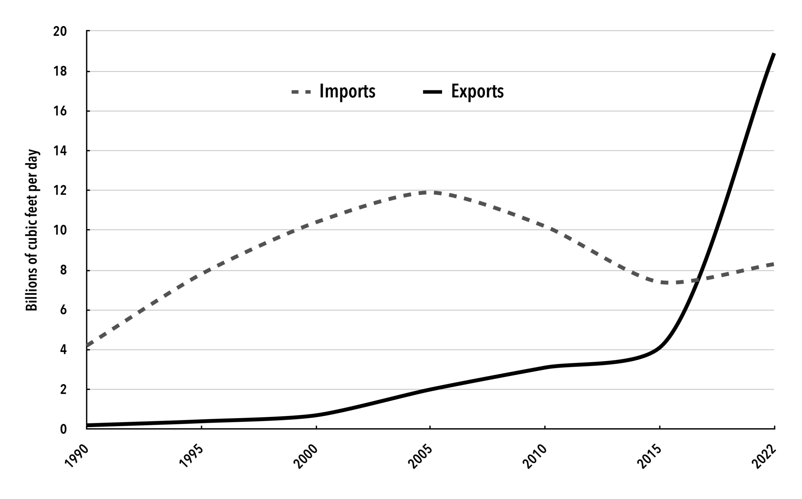 En el ámbito del comercio energético global, el proceso de reposicionamiento imperial estadounidense dentro de la industria energética basada en fósiles, desencadenado por la Revolución de la Esquista, ha sido significativo no solo porque Estados Unidos se volvió autosuficiente en el mercado global de gas natural, sino también porque posicionó al país como el principal exportador mundial de gas natural. En 2023, Estados Unidos consumió entre 80 y 83 mil millones de pies cúbicos de gas natural al día, mientras producía 100.500 millones al día.14 Esto situó al país en una posición de producción excedente, con exportaciones que aumentaron de 0.200 millones de pies cúbicos diarios en 1990 a 19.000 millones diarios en 2022, como se muestra en el Gráfico 2. En 2022, 11.000 millones de pies cúbicos diarios de las exportaciones estadounidenses de gas natural eran gas natural licuado, transportado principalmente por mar, mientras que 9.000 millones de pies cúbicos diarios se enviaban por gasoductos.15 Como resultado, Estados Unidos no solo se consolidó como el mayor productor mundial de gas natural, sino también como el principal exportador de este recurso energético a nivel internacional (véase el Gráfico 3).
