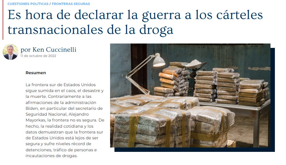 Por esos días de 2023, una de las propuestas que le alcanzaron fue un trabajo de Ken Cuccinelli, ex subsecretario del Departamento de Seguridad Nacional en la primera Administración Trump, titulado “Es hora de declarar la guerra a los cárteles transnacionales de la droga”, y publicado en el Center For Renewing de America, un tanque de pensamiento de derecha. Cucinelli, además, fue el responsable de escribir el Capítulo de Seguridad del Proyecto 2025, una hoja de ruta para el gobierno trumpista creado por la Fundación Heritage.